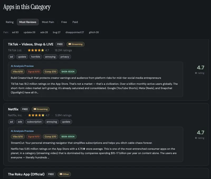 Every app scored on opportunity, competition, and user pain. See exactly where existing apps are failing.
