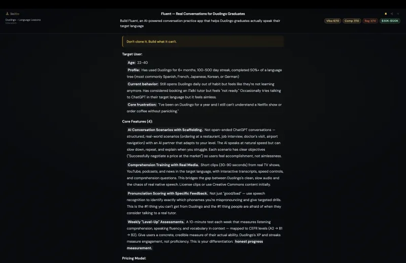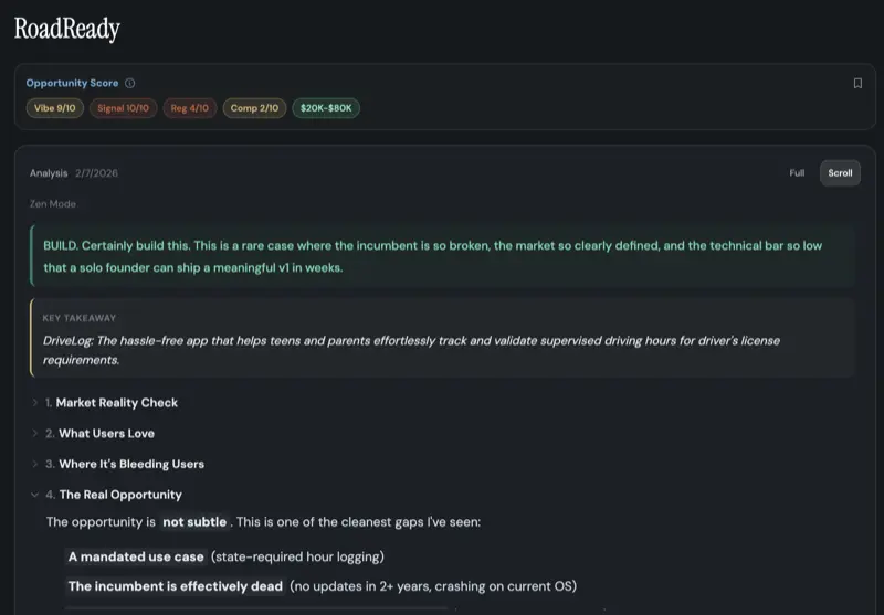 Each analysis comes with a concrete BUILD suggestion — what to make, why it'll work, plus revenue estimates and feature specs.